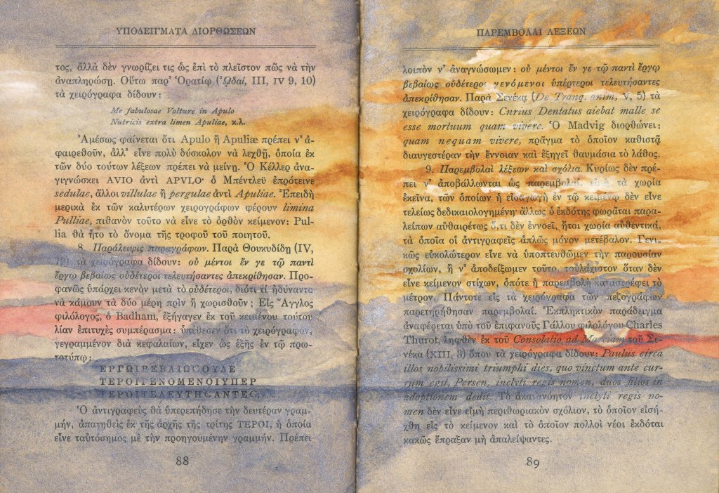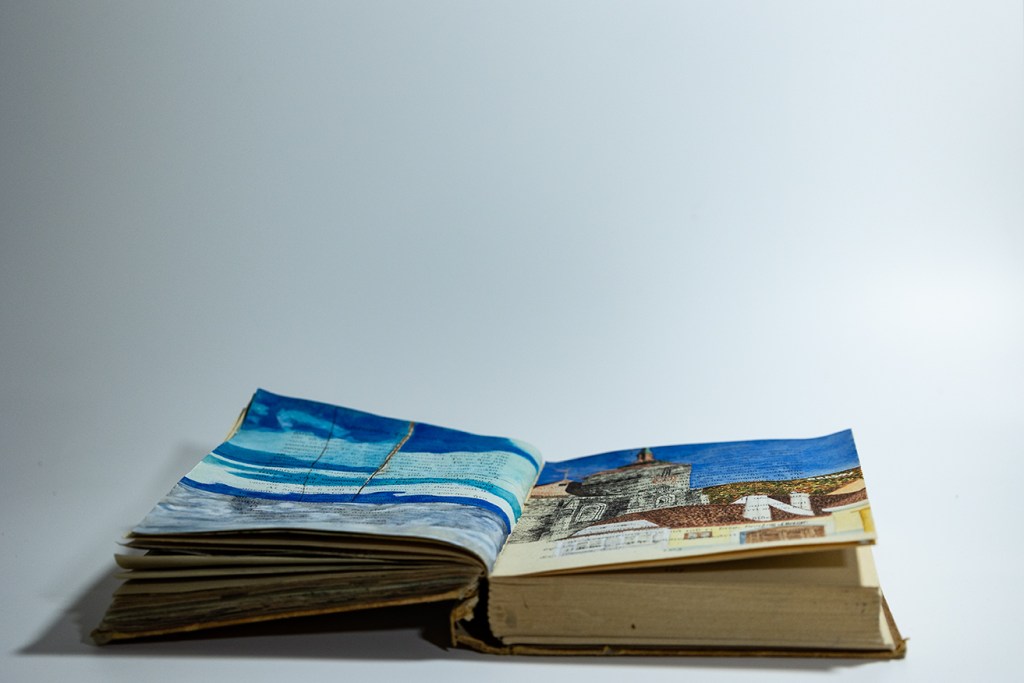 The first four images are a series of larger 17 x 22 inch watercolor paintings (2025) created by printing scanned images of selected pages from the book onto watercolor paper. After printing I paint on top of the scanned image. All following images are painted directly in the book at 5 x 7 inches.