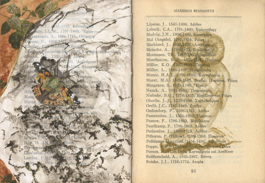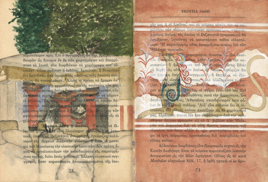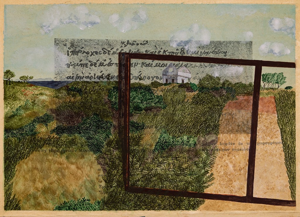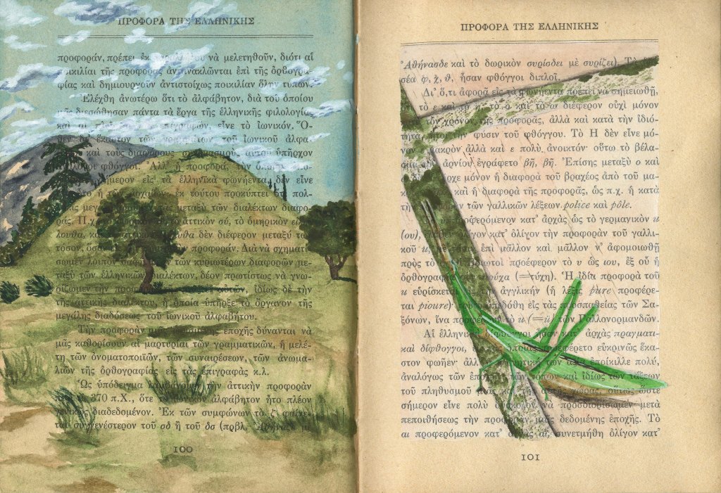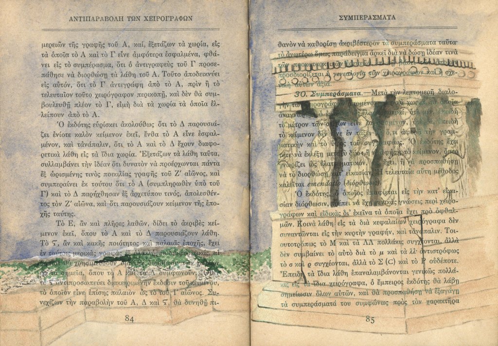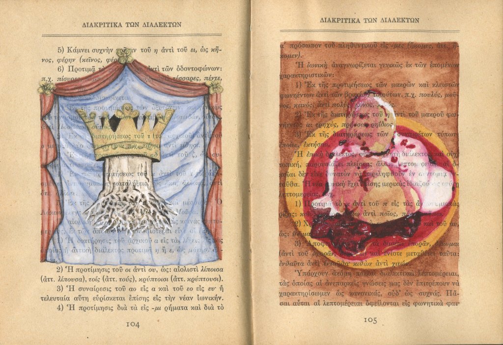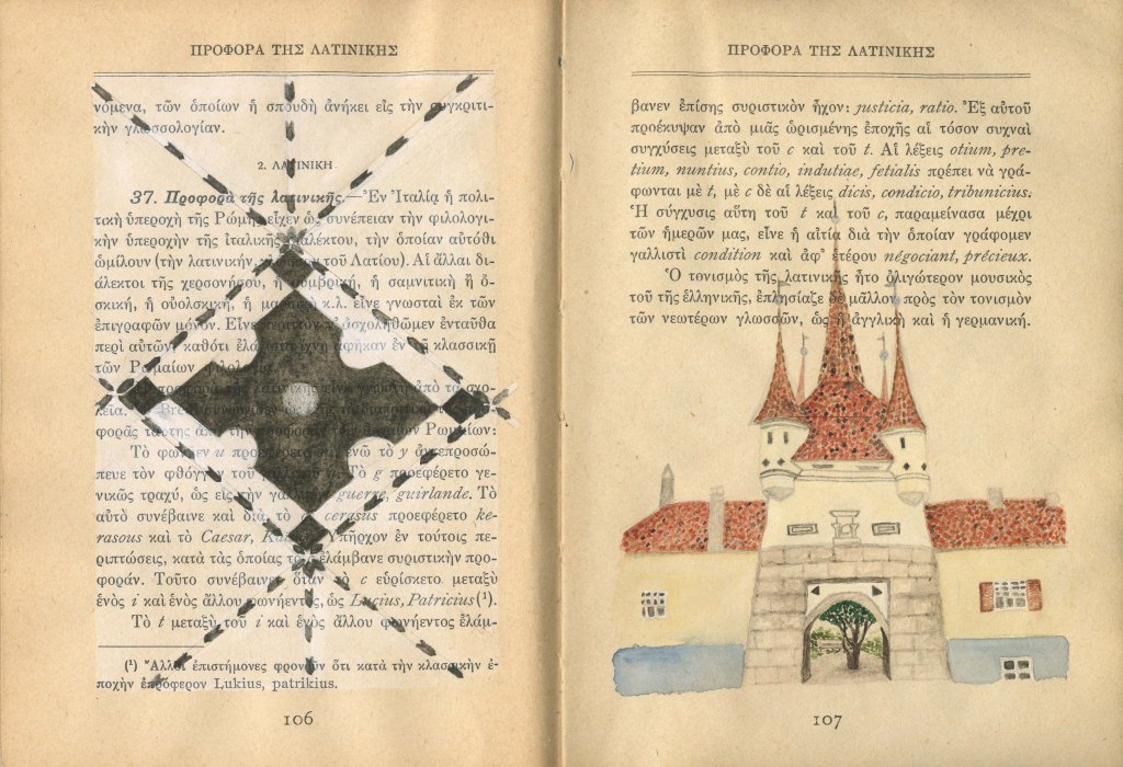 Book of Athena is an ongoing project that began in 2023 after spending several months in Greece. I purchased an old book titled “Athena” in Monastiraki, which speaks to both the goddess and the city of Athens. Printed in 1930 in Greece, its binding is in delicate shape. Many pages include text, illustrations, tables and graphs of data that become a graphic layer onto which my imagery is added. I’m using this book as a travelogue to record images in watercolor from my time spent in Greece, Romania, and Istanbul. This visual travelogue reflects on memory, ancestry and history, often layering qualitative and experiential imagery atop the quantitative printed page. It is inspired by the diaries, handmade/handwritten/hand-illustrated books, records of information and data, and history making/telling that have been part of human culture for thousands of years. I am interested in the remnants and fragments of the ancient past that have survived and their presence in our present, the record of qualitative versus quantitative information, and our ability to stitch together a narrative, not a whole narrative. I am curious about the missing pieces and our inability to know that history in its entirety.